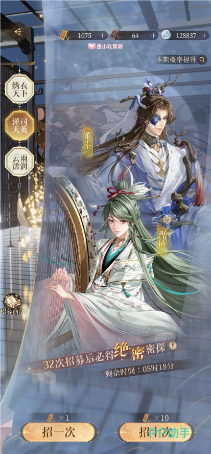如果想要培养曹植的玩家,命盘推荐用洒落赋韵、音义既远,洒落必备,可以透过操作让曹植的技能变四灯和BOSS对轴;音义则是将沉吟效果转群体,面对一群怪集体放大绝时好用(例如新手期常会卡住的集体黑山军、暴躁船夫等等)。开两格就好了不建议投入太多资源给他。曹植天赋“攻击时得到阳律”、“防御时得到阴律”,每次顶替阴阳律时都有不同效果。配合命盘洒落和音义,如果敌方为四灯,曹植四回合一循环的操作为「A↓A↑」。如果敌方为三灯,可以配合陈登点灯或是小乔沉默将敌人拉成四灯来对轴。官方直接写明「沉吟、沉默、麻痺、睡眠」是同一组的控制效果,这四个会一起免疫/不免疫,所以小乔是曹植的好队友。从9-13王允之后的BOSS几乎都免疫沉吟,逃掉的课总有一天要还,该练的卡还是得练。不过你永远不知道官方会不会新活动放一只超强BOSS但可以被沉吟,有没有曹植将会是天堂地狱的差别。如果求稳的玩家还是得拥有一只,以备不时之需。
