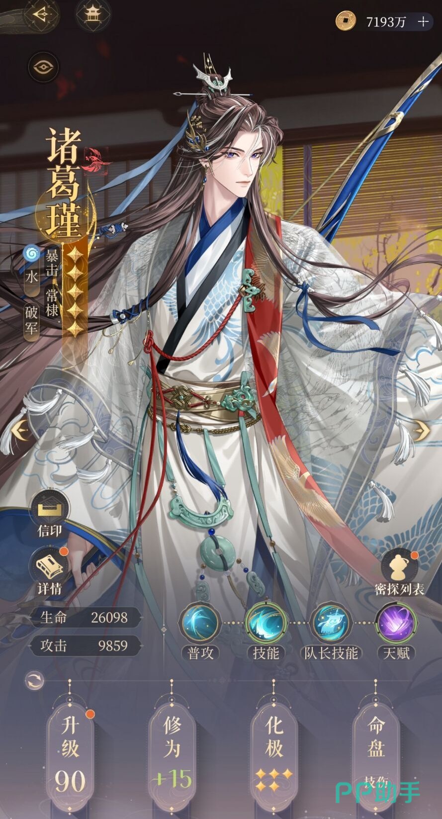 诸葛瑾是水属性的破军密探,角色的特征是暴击与常棣。他的技能与天赋如下: