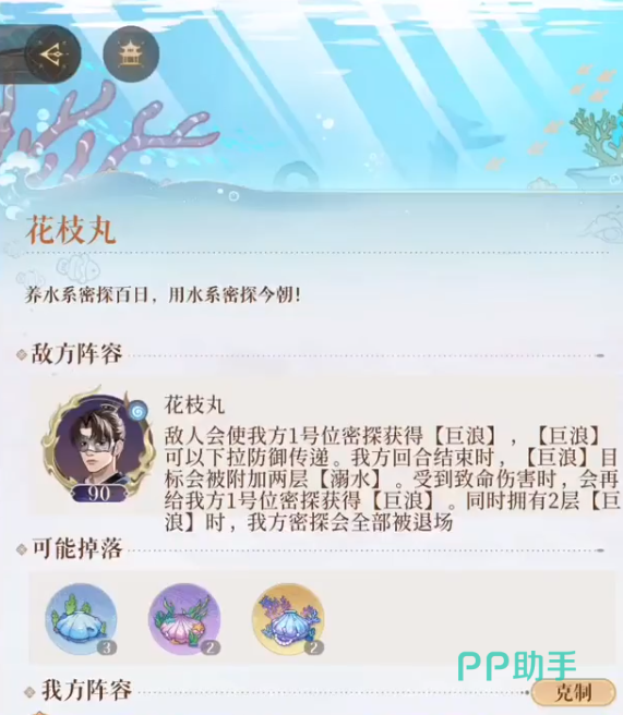 Boss花枝丸的等级为90级,是水属性,技能特性是使玩家队伍1号位的队长获得巨浪debuff,叠加上这个debuff的角色。在回合结束的时候会附上两层溺水debuff,受到致命伤的时候,会给1号位队长再挂上巨浪,同时拥有两层巨浪,玩家的角色全部强制退场,视为挑战失败。