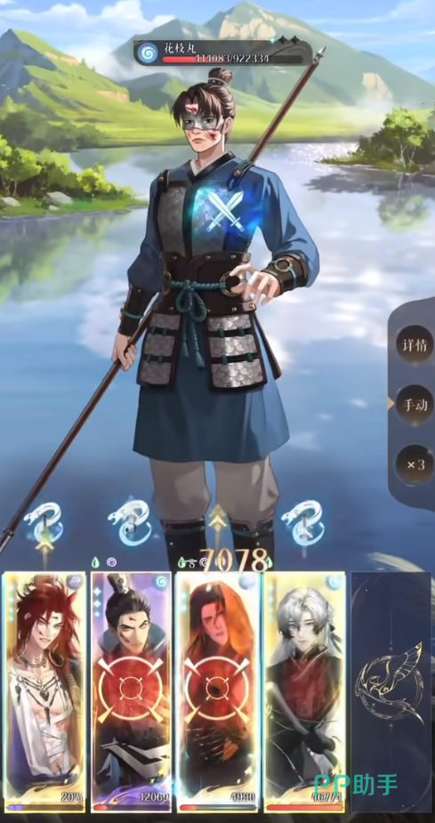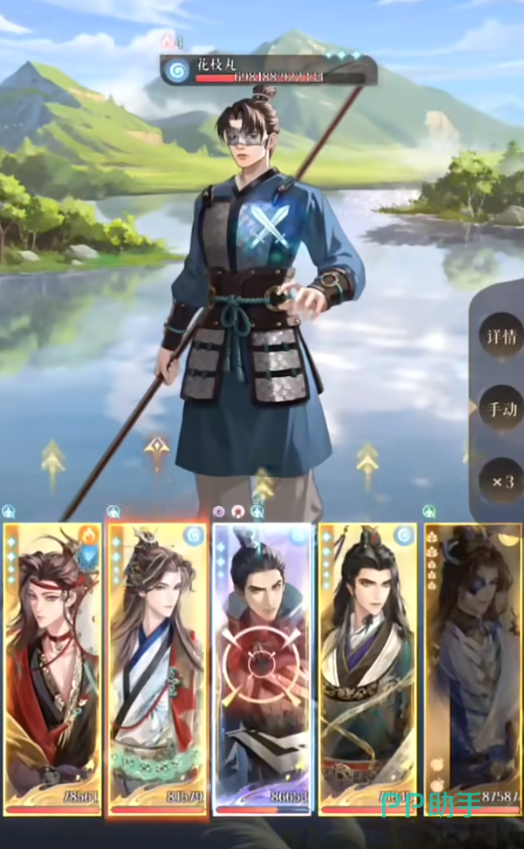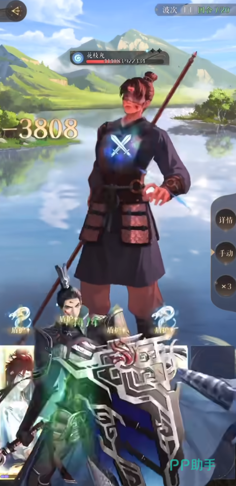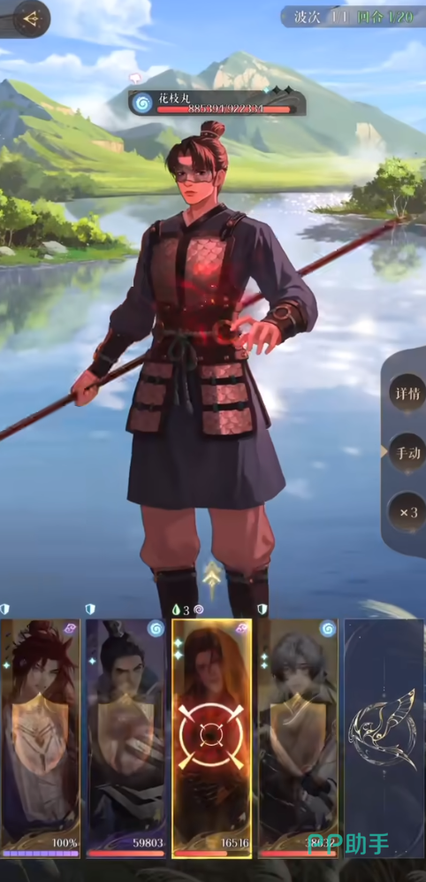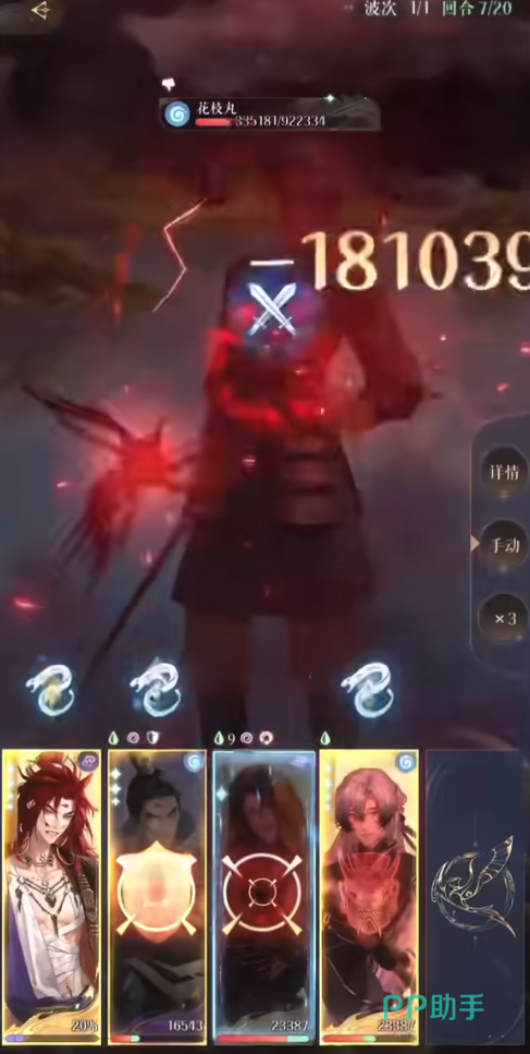 第1回合开局张鲁将巨浪debuff,传递给3号位置的张角,4号位置的王粲全程防御,不建议开大招。张角大招能量非常短,可以不断刷大招。因为花枝丸boss有两条命,第1条血条磨掉之前都可以使用以上的步骤。