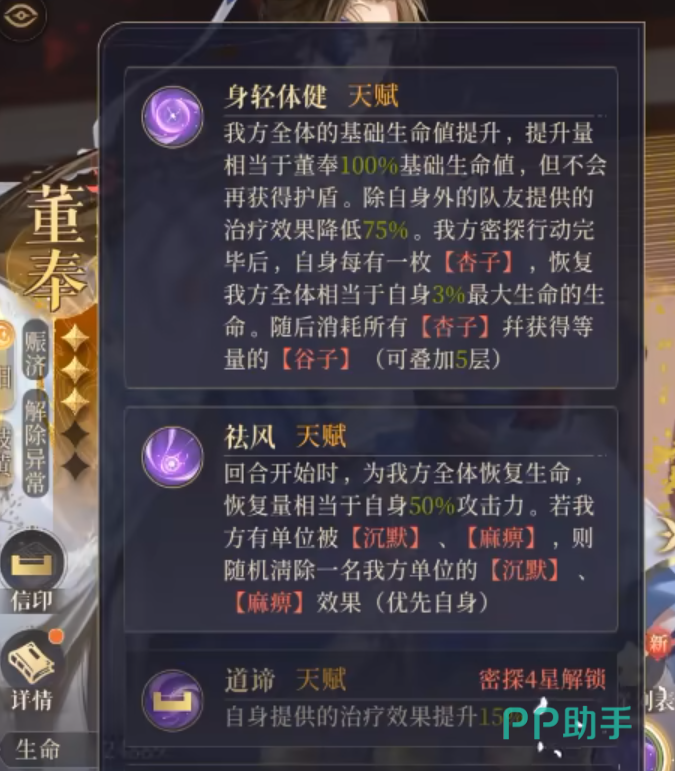 董奉是阳属性的岐黄角色,战场定位是赈济与解除异常,他的技能天赋如下: