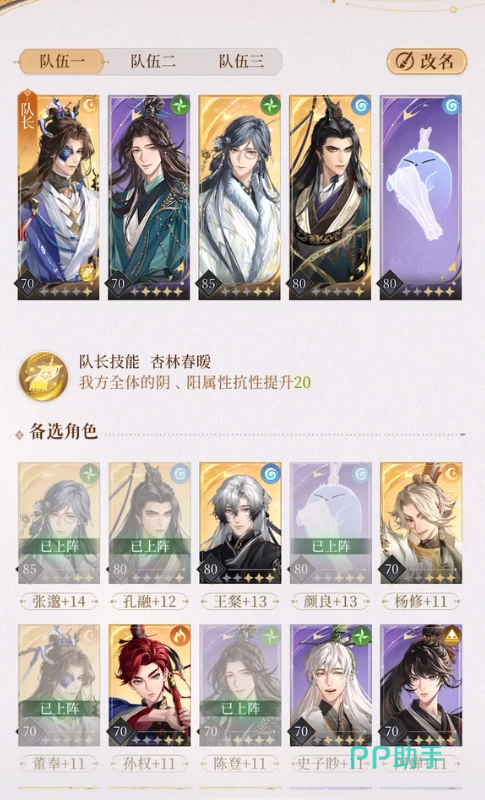 配队推荐:董奉+孔融+甄宓+dot输出手/普攻队输出。为了触发随营医者的效果,队伍里面不能超过两个龙盾加岐黄密探。