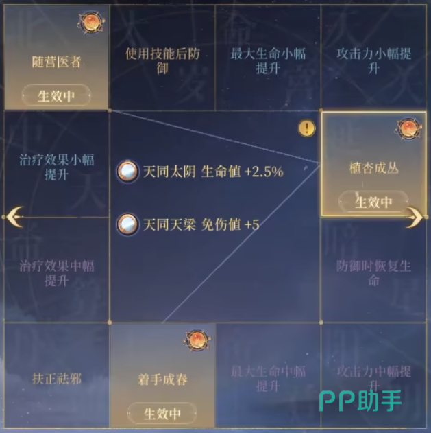 植杏成林是后期必带,效果可以让自身每使用三次普攻额外获得相当于5%的最大生命值回复,并且多获取一枚杏子。随营医者则是单辅助的时候选择,给全体队友加30%最大生命值与15%的攻击力。着手成春是下拉防御之后为全体队友恢复HP,恢复的效果相当于董奉20%的攻击力,随后再多获取一枚杏子。
