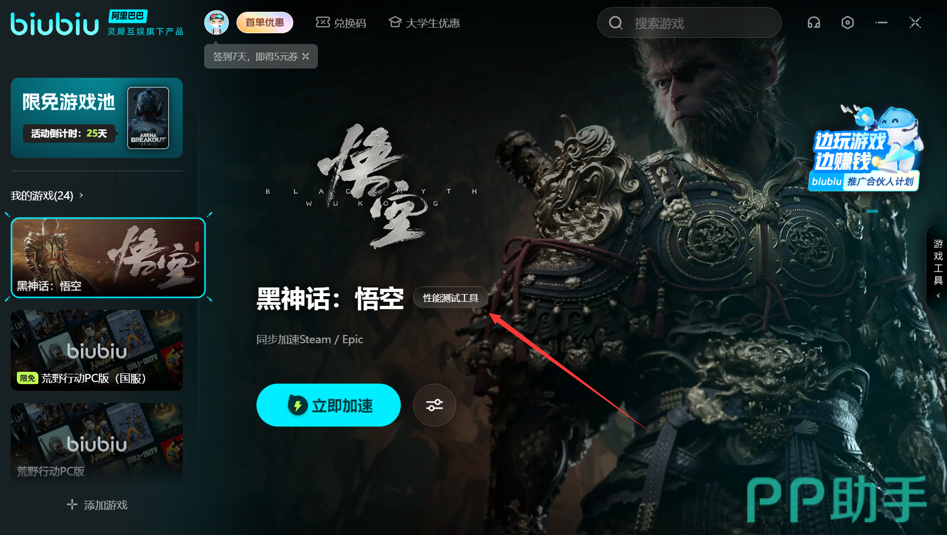 其实获取方法非常简单,只需要大家升级一下预售游戏本体,再来一个DLC就能直接领取了。但是获取方法还是有点门槛的,我们首先去下一个biubiu加速器,然后在biubiu加武器的界面中搜黑神话悟空。然后我们点击旁边的【性能测试工具】,进入到界面之后我们去找黑神话悟空的升级DLC,在升级完dlc之后,就能在游戏上线之后,前往游戏中的土地庙,即可轻松领取这份专属的豪华大礼,其中就有大家关心的【铜云棒】了。