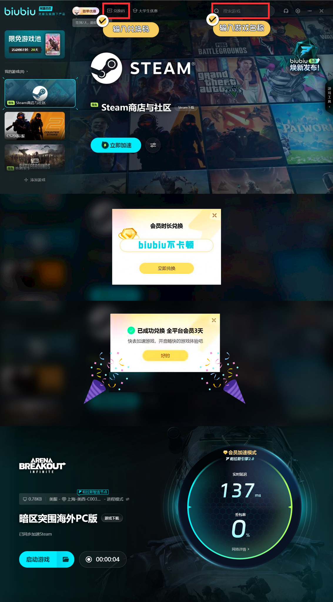 当然还有一个最重要的,咱们得从网络下手。网络就像是游戏的生命线,如果它不稳定游戏自然就玩不顺畅。玩家可以试着换个网络环境试试,比如从家里的Wi-Fi换到手机的流量或者反过来也行。当然给游戏来个网络加速,有时候也能让问题迎刃而解。biubiu加速器它就像是给网络穿上的“快跑鞋”,让游戏路上的绊脚石变少了。新用户注册就有24小时免费加速体验,新老朋友们直接输入【biubiu不卡顿】这个兑换码还能再享受三天加速时间。玩这款游戏还可享受首月加速直接免费,这福利不领白不领。咱们玩游戏不就图个顺畅和开心,biubiu加速器正好能帮上忙,试试看保证让玩家的游戏之旅更加流畅愉快。
