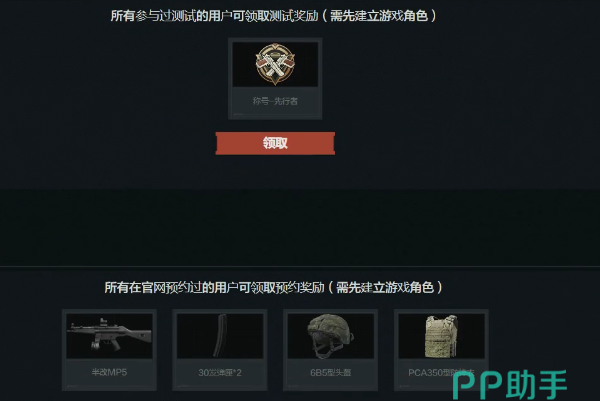 第一个便是预约奖励,我们在游戏启动器里就能看到领取的链接。点击链接跳转打开网页,登录游戏账号后就可以根据自身情况来领取奖励了,其中便有先行者的称号、一把半改MP5、两个三十发弹匣、6B5型头盔、PCA350型防弹衣等物品。