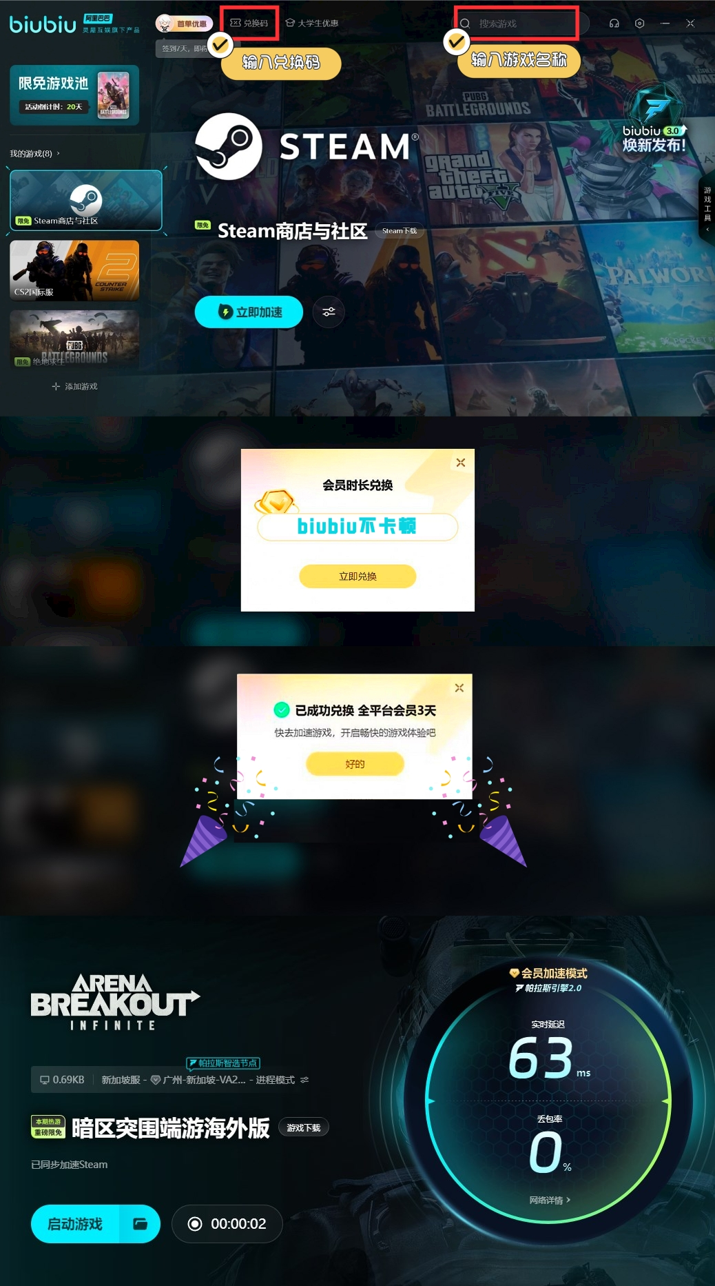 如果想获得更长时间的体验,那么玩家还可去使用【biubiu不卡顿】口令,在兑换界面中去获得72h的加速,关键就在于不论是新还是老用户皆可去兑换,新用户在叠加这些优惠后,实际上可获得3+1天的免费试用。