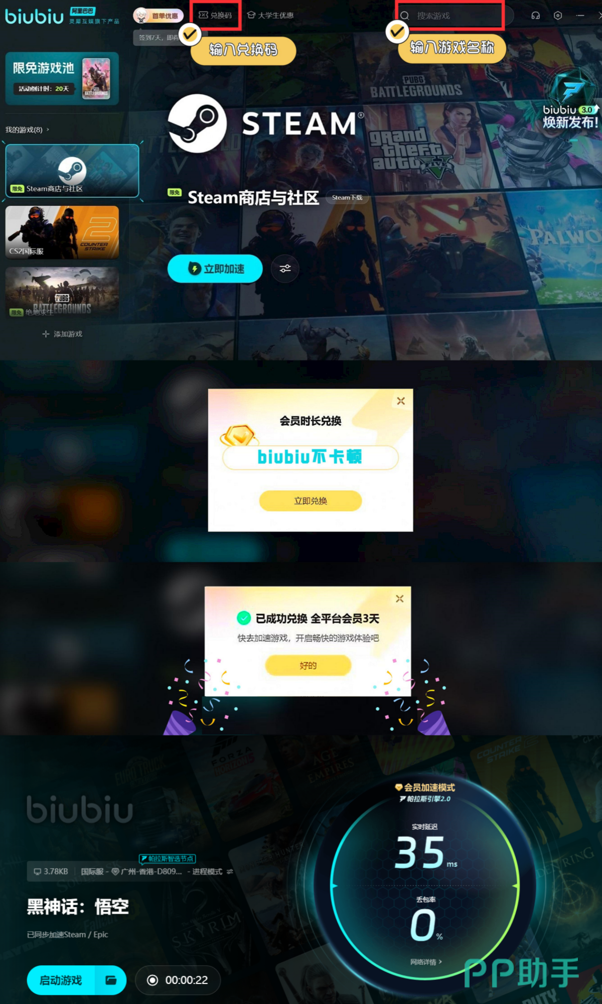 此外大家作为平台的用户,此时去点击兑换,然后在其中去输入【biubiu不卡顿】便能够得到72h的加速时长,如此一来新用户便可得到96h的加速福利了。