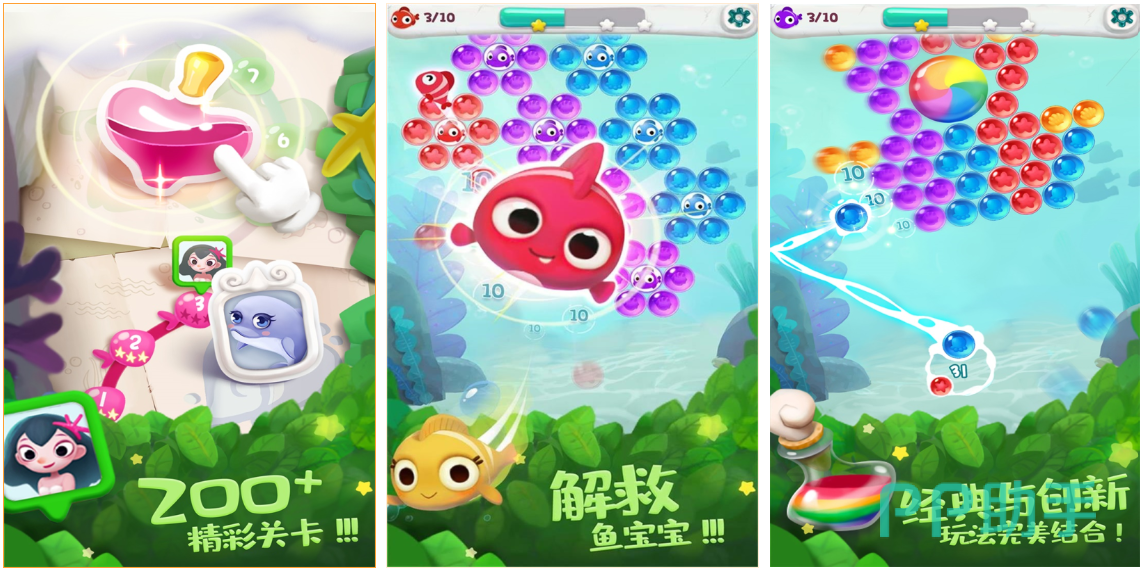 这是一款消除类型的游戏,画面非常的q萌可爱,玩法也是以经典的消除玩法为主的,同时也设计出了多样性的关卡,让大家在闯关的过程中有着无穷的乐趣,玩家要做的就是通过将泡泡消除的方式,来将海洋生物全部给解救出来,而且还会为大家提供一些辅助道具,可以帮助大家成功通关,体验一下不同的泡泡龙碰撞在一起的效果,当泡泡龙消除的时候,还会有着绚丽的画面。