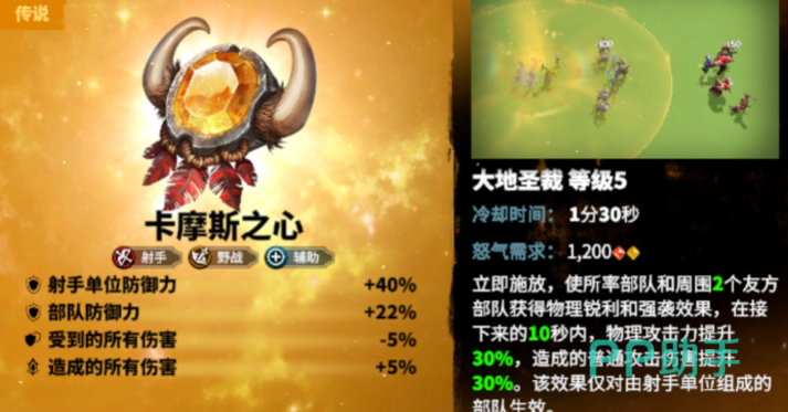 宝物选择方面,如果是尼尔科加克岚西的组合,主将用响环矛或影之刃, 携带弓兵输出城市皮。如果是霍克斯加克岚西的话,主将带卡摩斯之心,也是带弓兵防御城市皮。这样霍斯克的1技能与卡摩斯之心技能效果给到的加成可以让队伍在20秒内打出许多反击伤害。
