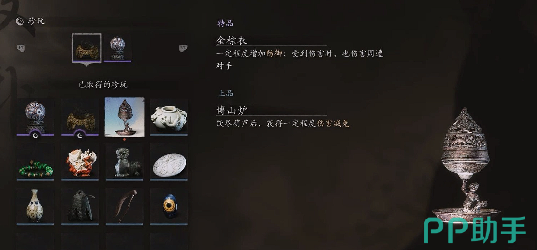 珍玩推荐三:博山炉,准备好放手一搏了吗。拿上博山炉跟boss来个破釜沉舟!效果是我们在饮用完全部葫芦之后,会给自身附加一个伤害减免buff,获取的话需要完成游戏第二回BOSS沙大郎,拿到【飞龙鳞片】,然后要回溯到游戏的第一回,具体是前往【苍狼林-林外】在瀑布前进行互动面对更为强大的BOSS——赤髯龙。当玩家终于战胜赤髯龙时就可以拆开宝箱拿到上品-博山炉。