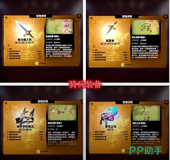 骑兵这个兵种在万龙觉醒里面是伤害比较高的一个兵种,这类兵种在武器选择上就需要选择那些伤害高的武器,比如索兰德之剑、弑君者、青鸟之羽、狼女的头盔。