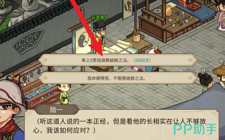 云游道人是一个神秘的人物,他掌握着许多不为人知的秘密。在游戏的某个特定时间点,他会告诉你将会遇到血光之灾。这时候,玩家需要做出选择,是花费5贯钱请教破解之法,还是置之不理。显然,愿意花钱的玩家将会有所收获。