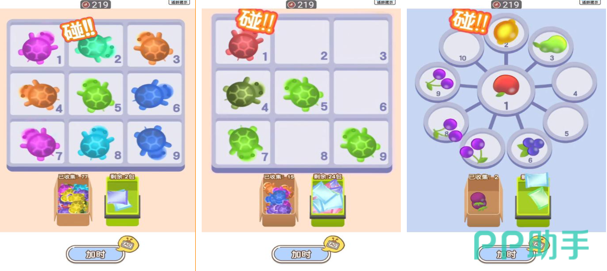 小乌龟对对碰是款纯单机的合成闯关类小游戏,玩家要点击拖动屏幕上颜色相同的乌龟进行配对,特色鲜明的对对碰玩法加上魔性的美术UI令玩家印象深刻,独创的玩法也足以锻炼大家反应速度以及记忆力,愉快有趣的游戏氛围也让这款神作的趣味性大大提升,海量实用的小道具也会让对对碰的流程更加丝滑。