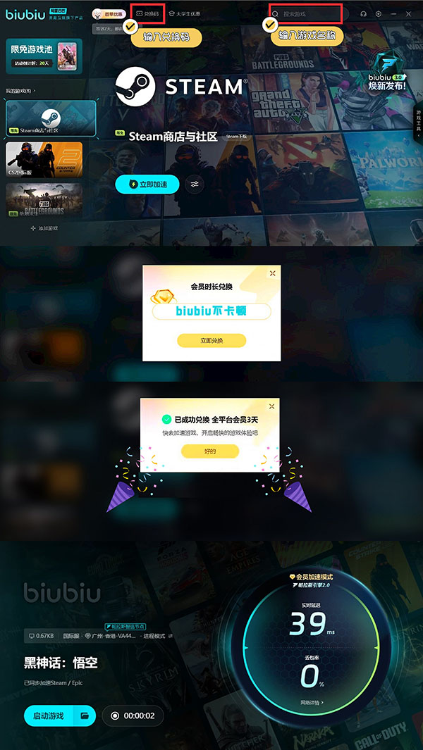 大家在下载黑神话悟空的过程中,如果遇到了网络卡顿、下载速度很慢的情况,可以下载上面的biubiu加速器,让它来给自己的网络提提速,这样就能更快下载好游戏进行游玩了。而且现在下载注册biubiu,新人将可以直接获得24小时的免费体验时长,此外输入【biubiu不卡顿】可以兑换得到72小时的额外使用时长,新老用户都能同享这个兑换码福利哦,可以说是大家下载游玩这类游戏的首选加速器了。