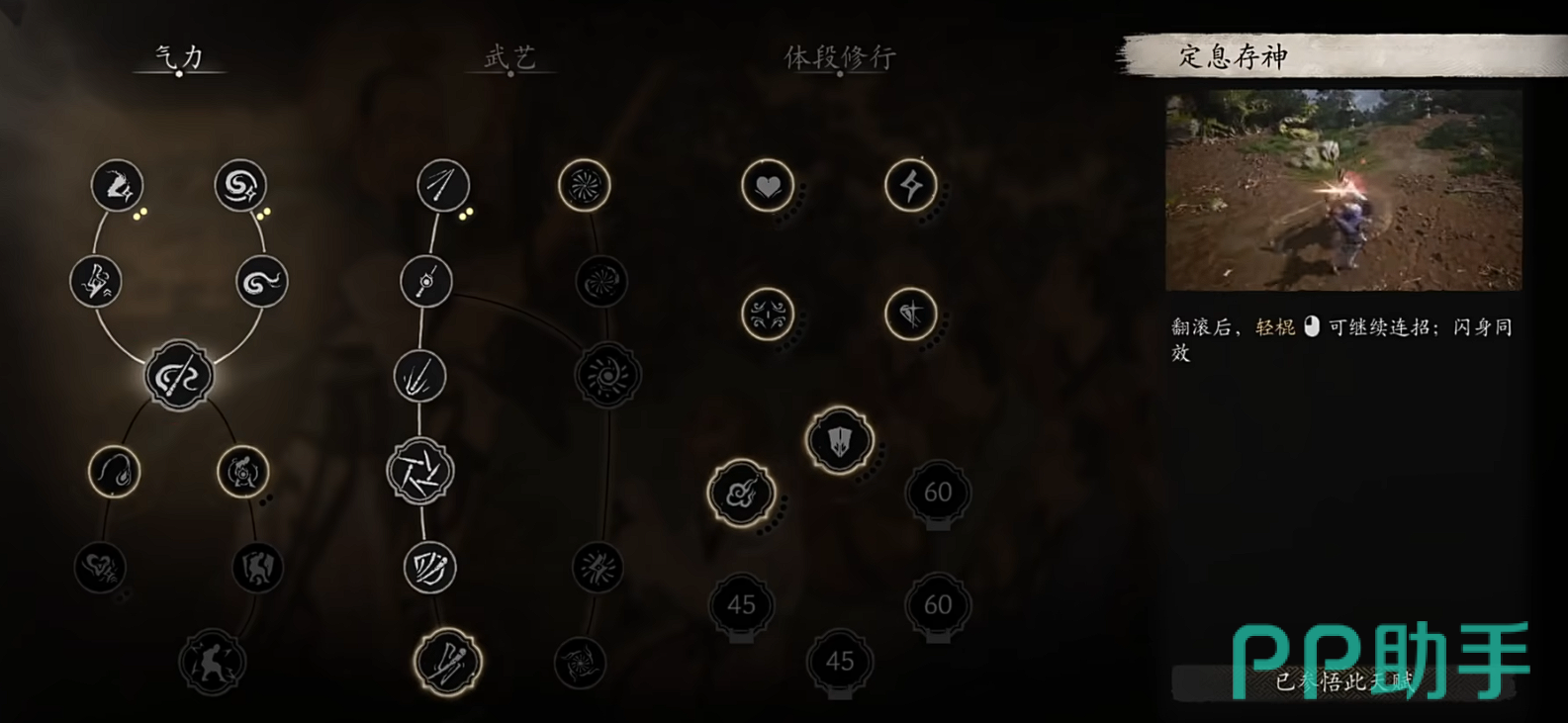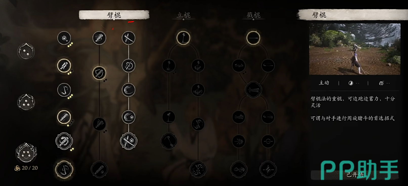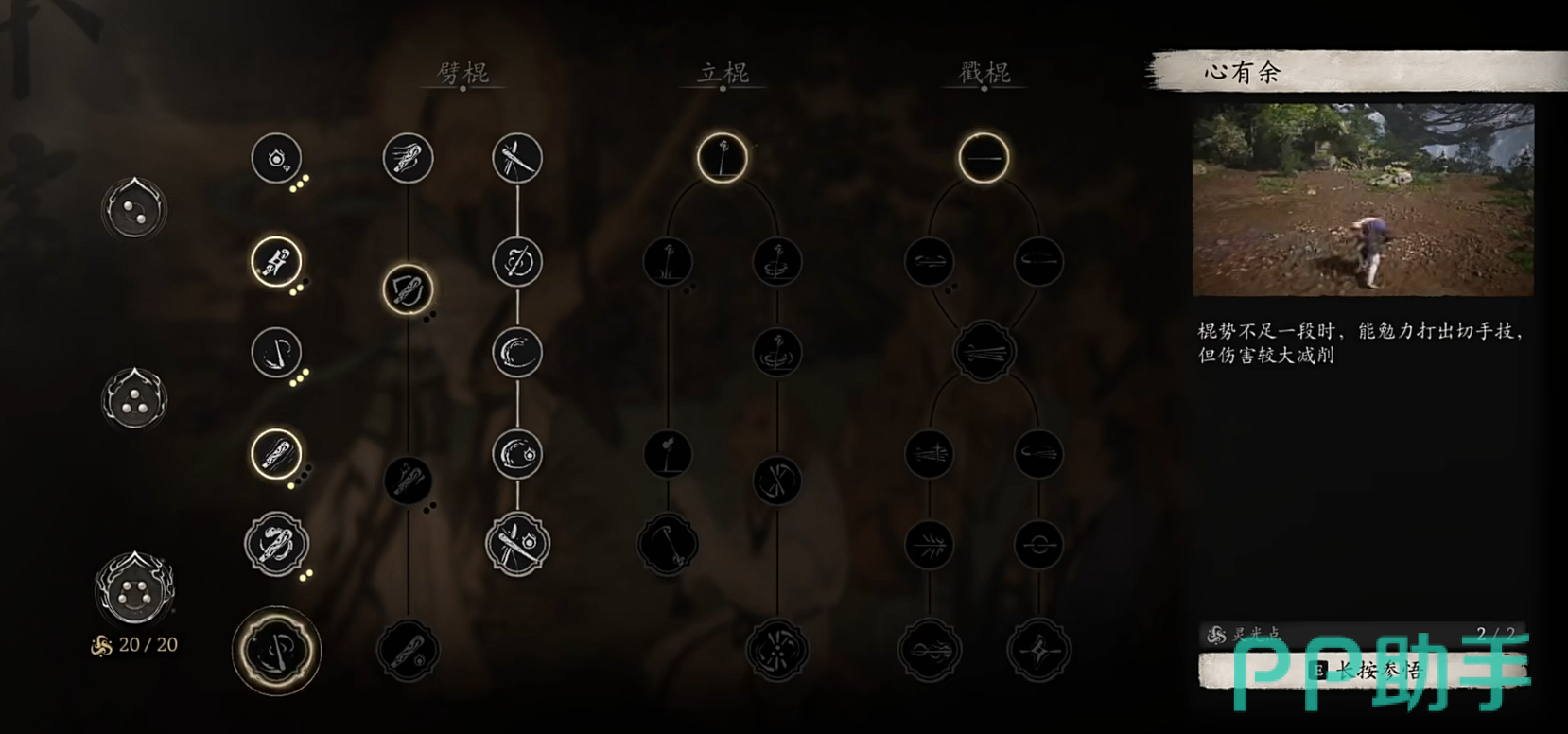 而后期的话可以视情况,点出范围攻击与戳棍技能,这时候需要面对更强大的敌人和BOSS,此时需要进一步提升角色的综合能力。根基技能中的气力技能点右侧,点到七夕存神,增加闪避后的连招能力。武艺技能建议左侧点到第三个,棍花技能点出移步即可。体段修行中的血量、气力和法力是后期生存的保障,建议优先提升。