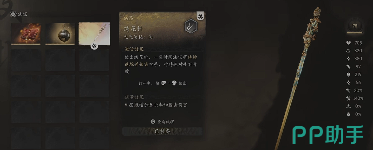 绣花针是游戏中的一个重要法宝,它不仅是原著中非常著名的一大法宝,更是解锁新能力和游戏剧情的关键。绣花针的获取方法涉及到游戏的第四章节。玩家首先需要到达盘丝洞的碎玉池,那里有一个巨大的茧。击败茧中的BOSS后,BOSS会逃到另一个地方。然后我们玩家需要前往黄花观的金光苑,沿着两位道士的视线方向直行,然后不断向上攀爬,在岔路处左转。在这片空地中,玩家将遇到BOSS,进入广场后BOSS才会出现。战胜BOSS后,玩家将解锁隐藏地图紫云山,完成紫云山的任务后,绣花针就会到手。