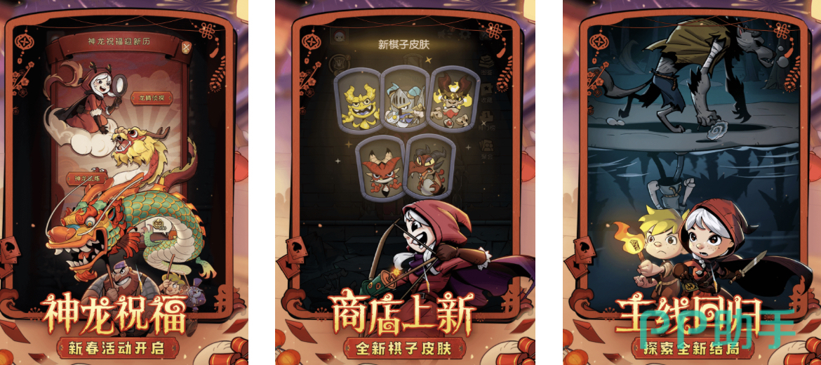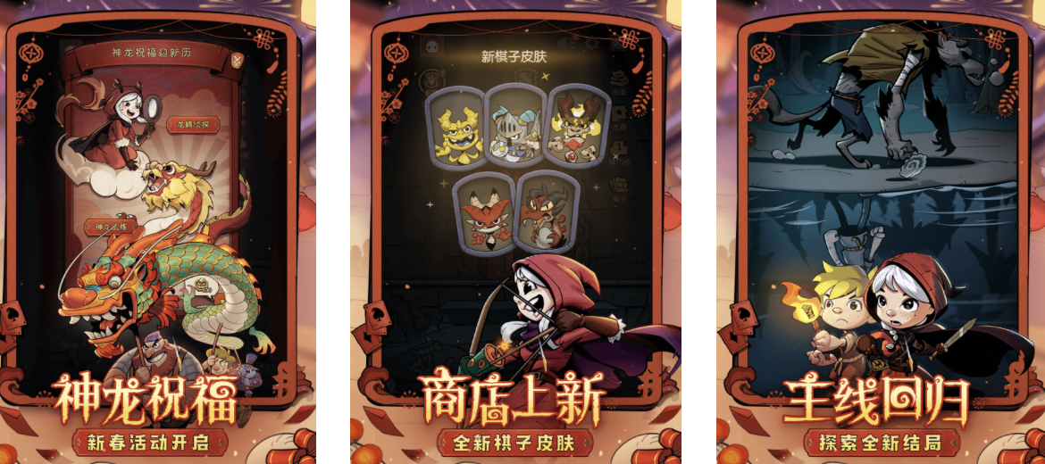 I与魔女共舞活动下,玩家可以解锁魔法战袍以及相关技能,在舞会中与NPC进行线索的讨论。图鉴和通行证记录着玩家的卡牌以及通关关卡,玩家可随时查看。除了召唤英雄之外,玩家还可以在珍藏的棋盒中布下棋局。在更多的主线玩法中,玩家可以获得机甲小红帽等多个帮手,在战斗中法力增强。