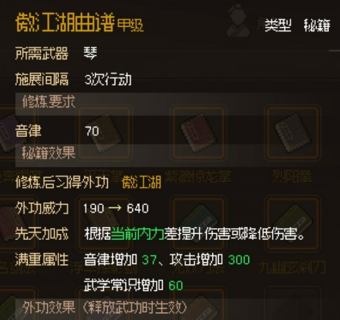 值得一提的是,剿灭九黎的任务之所以能顺利触发,部分原因在于你之前的选择。若你在此前结缘了苗彩蝶,并通过她的任务导致她脱离了九黎势力,那么九黎的整体力量将大幅削弱,为你剿灭他们铺平道路。而音律技能的高低不仅决定了你是否能获得傲江湖,还体现了你在江湖中的修为深浅。因此,提前提升音律技能,做好充分准备,将是你成功获取这门武学的必要条件。