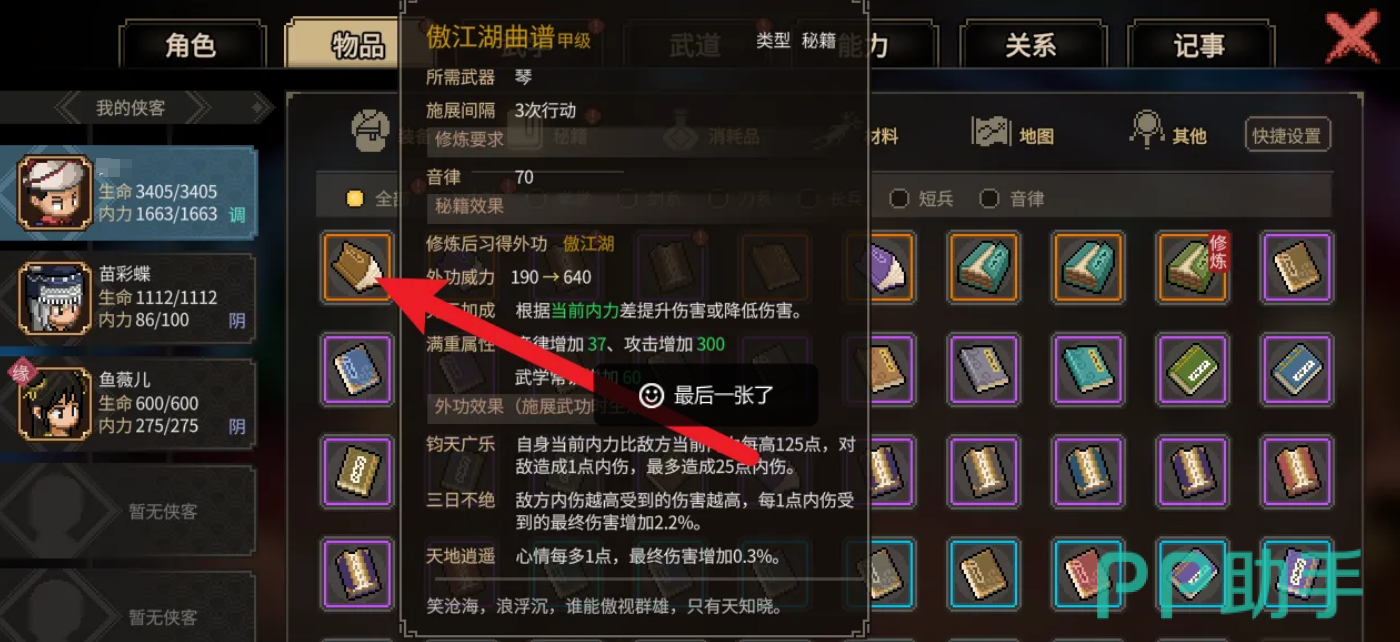 以上就是大侠立志传傲江湖获取攻略的内容了。甲级傲江湖在大侠立志传中的获取过程可谓步步为营,环环相扣。从任务的时间选择到角色好感度的提升,再到音律技能的要求,每一个细节都至关重要。只有在稳步推进剧情的同时,充分把握每一个关键节点,你才能最终获得这门绝世武学。