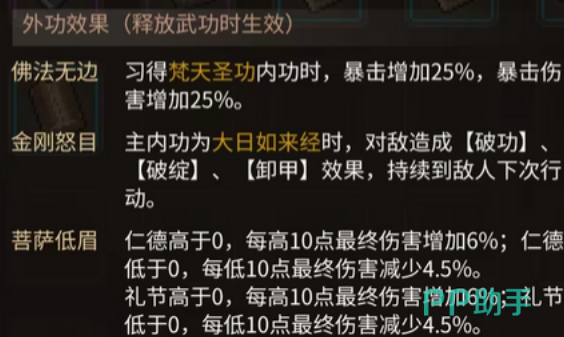 如来神掌不仅以强大的破坏力闻名,还能通过与内功的搭配大幅提升战斗效果。例如,当玩家的主内功是梵天圣经时,如来神掌的暴击率和暴击效果将分别增加25%。而如果主内功为大日如来经,如来神掌在攻击敌人时还能额外造成破功、破绽和破甲的效果。