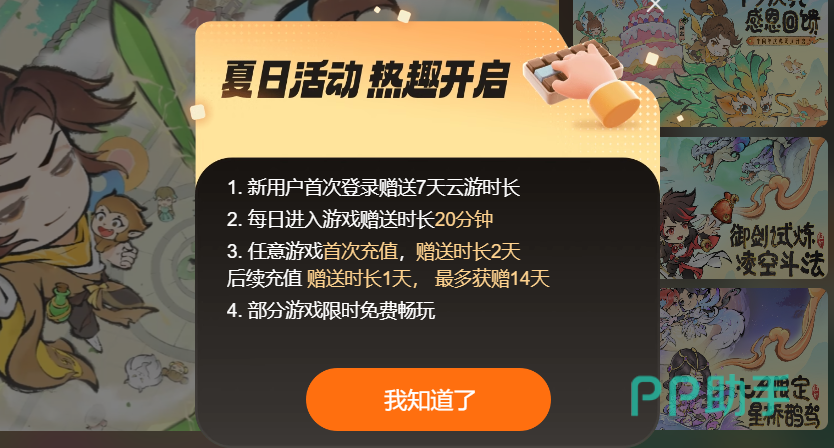 目前九游云游戏给新用户提供了7天的免费云游戏时长,并且每天进入游戏也会送20分钟的时长,任意游戏首充送2天,后续充值送1天,最多送14天。对于部分游戏,还提供限时免费畅玩服务。
