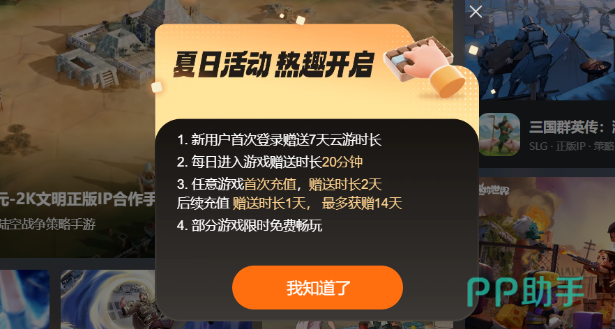 同时九游云游戏平台的夏日活动也不可错过,新用户注册的话就有7天时间可以去畅玩该游戏了,而且只要每天登录,就会有20分钟游戏时长赠送,即便是氪金,都是有福利的,首充可获得2天额外的游戏时间,是不是非常划算呢。