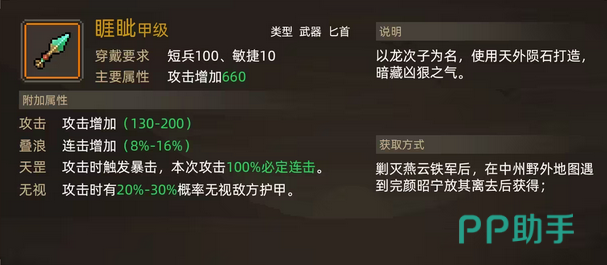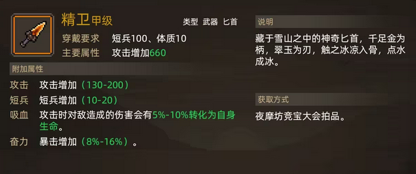 玩家在获得精卫这种匕首之后,可以让角色在战斗中进行训练从而将攻击能力提升到130以上,当角色晋升后最高可以达到200的增加。相较于其他兵器,它在奋力方面的加成更加明显,可以增加8%左右的暴击,在同样的情况下可以给敌人更多的伤害。同时,它的吸血功能最高可以达到10%的转化率,这对自身的生命只有比较高的增长,利于玩家进行战斗并且收获最后的果实。