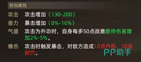 更值得一提的是龙胆的独特效果。它的“气盛”属性使得当攻击为外功时,自身每多50点战意,最终伤害可以增加2%到5%,这意味着在战意值高涨的状态下,你的输出能力将成倍提升。而“爆伤”属性则更为直接,每次触发暴击时,都将对敌方造成10点内伤与10点封穴的额外伤害,在一场高强度的战斗中,这些额外伤害可能会成为决定胜负的关键。