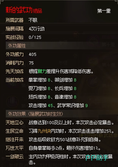 例如,当你选择以匕首为主功法,剑法为辅功法时,系统会根据你选择的这两种功法的属性,生成一套全新的武功。这套武功的威力和属性会依据主功法和辅功法的搭配来决定。如果主功法的外功威力较高,那么生成的新功法威力也会随之增加。这种设计不仅增加了玩家的自主性,也让武功的培养更有深度。