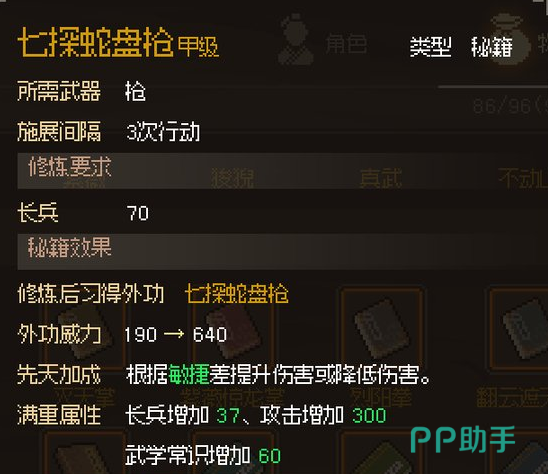而对于七探蛇盘枪本身的一个使用,不少玩家也好奇如何可以发挥最大的效能。七探蛇盘枪本身自带敏捷提升伤害的先天加成,所以玩家只需使用就可以增加一定的伤害值。而在一些外功效果方面,玩家可以使用金蛇缠身造成敌方损失一点流血,当整个场面已经对敌人造成格挡效果时,玩家使用七探山河就可以让敌人额外的损失十点流血。为了增加敌人的伤害,玩家也可以使用盘蛇护邦技能。