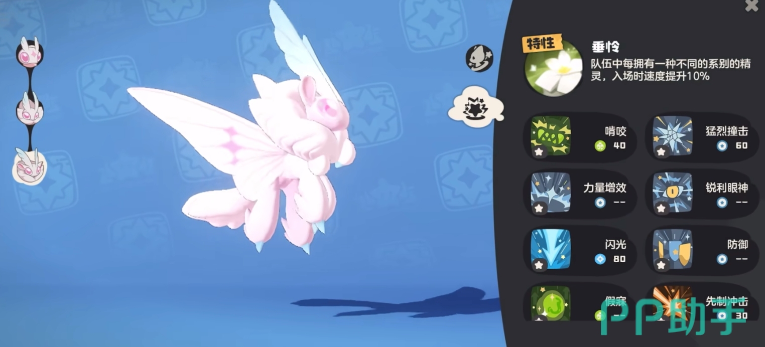然后说下绒仙子这个精灵。这个精灵自带的特性名为垂怜。自身效果是依据队伍中精灵种类的多少提升精灵速度。然后技能逆光伤害很不错,并且玩家所带的精灵种类越多,技能为例也就越大。技能闪光也很不错,自身80的输出伤害,还有假寐这样的能量回复技能,整体强度很不错。