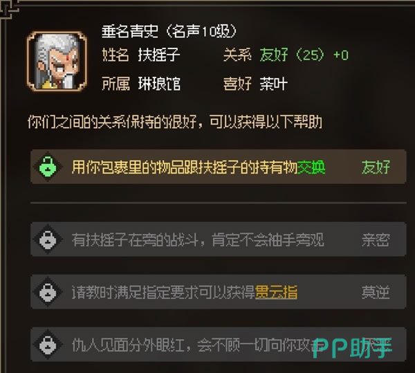 现在小伙伴们都知道大侠立志传敌对了怎么恢复吧!只要找到职业调解人扶摇子,再加上金银攻势,就算是敌对关系,他也能帮你恢复。不过要注意的是,扶摇子只调节普通的势力、人物,对于朝廷以及西南地区、西域地区这些偏远位置的势力和人物是无法调解的,可能他的朋友圈还没有那么广泛吧。