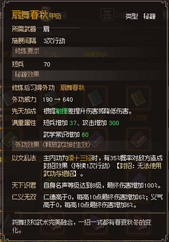 在学习完儒十三经后,如果主角此时鉴定字画等级达到四级或更高级,就可以去与馆内的石碑交互。之后分别打败四周石碑唤出的敌人,最后打中间那块石碑触发的。完全或身后即可领悟扇舞春秋秘籍,需要使用主武器为扇子;效果主要是配合儒十三经而存在的,各项属性也是出奇的高并带有各种特殊效果。
