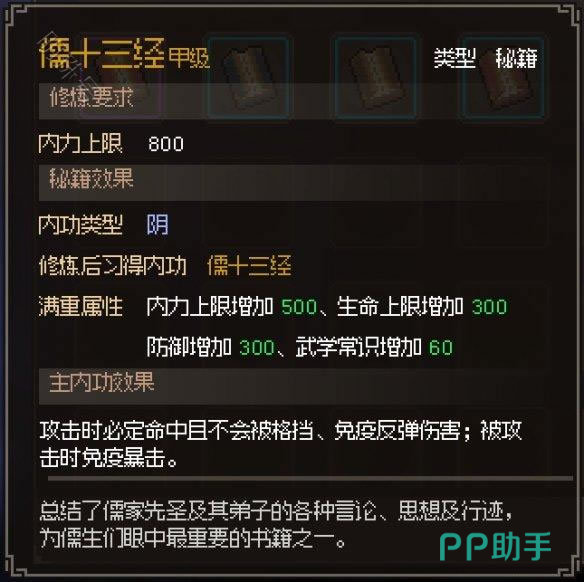 战胜老魔头之后可以获得儒十三经,作为最强内功秘籍修满之后可以增加内力和生命上限值各500点;以及防御和武学常识,同时还有其他特别的好处甚至超过了属性本身。