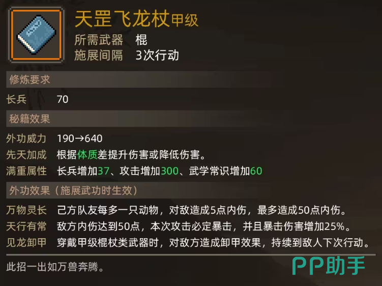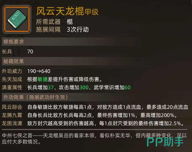 至于棍法,风云天龙棍堪称是玩家不可错过的一门武功。在龙脉宝藏任务中,击杀玄尘后与吴岳对话便可获得这一棍法,招式大开大合,宛如风云变幻。而天罡飞龙杖则是完成万兽山庄的珍稀药引任务后获得,招式灵动犀利,是棍法中的上乘之作。