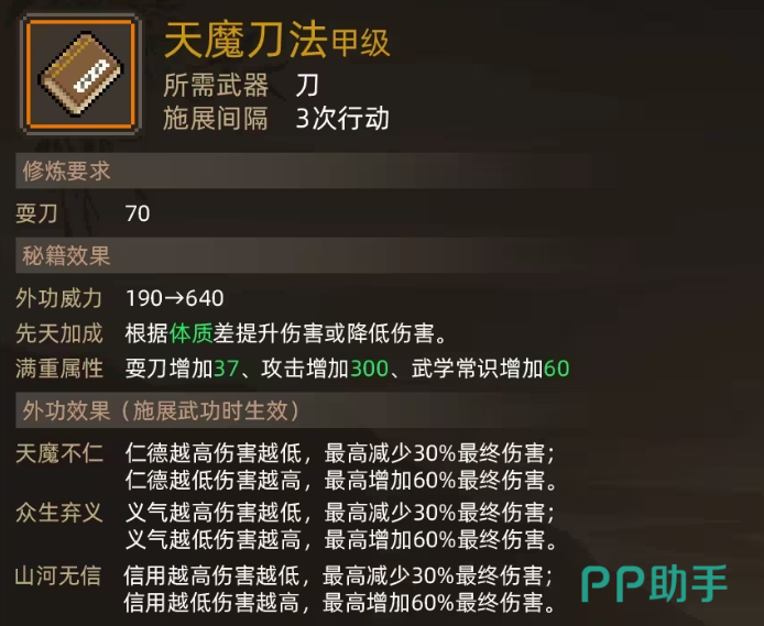 刀法方面,大侠立志传中也有不少令人惊叹的绝技。无双刀法便是其中之一,入老头门后,只需用3000门派贡献便可换得这门刀法,刀光如电,出手无双。而天魔刀法则需要玩家在冰牢内与老魔头建立亲密关系,闲聊之后便可从他那里学到这一门霸道至极的刀法。若想学会鬼轮斩,则需要在霖安城或破庙等地打败服部兵卫,然后再过五天,接受他的决斗挑战,并在云海崖打赢他,饶他一命后,便能在崖边获得这门鬼魅的刀法。