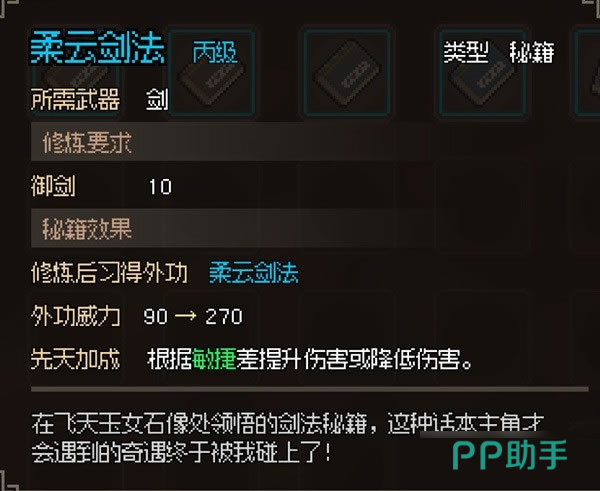 剑作为武林中使用最广泛的武器,在游戏中以敏捷而著称,很多剑法秘籍都会根据角色的敏捷属性而得到额外的效果加成。并且剑法出手速度很快,会获得很多出手机会施展绝技招式。在游戏中有很多剑法可供学习,大多数都能提升外功威力。