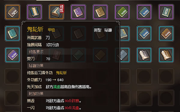 在游戏中最强的甲级刀法就是“鬼轮斩”,先天具备特效当地方流血时,具备嗜血的天性,能大幅提升自身造成的伤害值。除此之外带有两个附加效果,其中“燕返”能对敌方造成致盲效果,而“一闪”则可以造成流血效果;当触发流血效果时,天性中的嗜血又额外提升杀伤力,可谓越战越强。