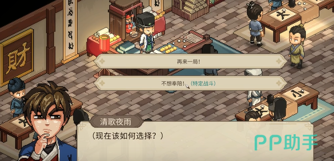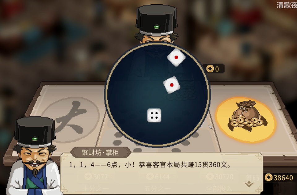 在与老板的对赌中,记得存档是胜利的关键。和赌坊老板的对赌常常会有输的局,因此,务必要多存档。经过一番激烈的对决,如果你最终击败了这位经验丰富的赌徒,作为胜利的奖励,老板将会把天女散花这门绝学传授给你。自此,你将拥有这项强大的武学心法。
