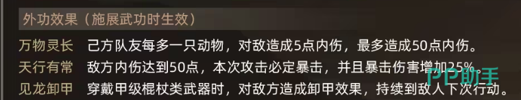 天罡飞龙杖的亮点在于“万物灵长”效果。这个效果让它在多宠物阵容中表现得尤为出色——每当玩家有一只宠物加入战斗,天罡飞龙杖就会为敌人附加5点内伤,最多可累积50点内伤。随着内伤的增加,天罡飞龙杖的另一个效果“天行有常”也随之启动,当敌人内伤达到50点时,玩家的攻击不仅会必定命中,还会触发暴击伤害,增加25%的额外伤害。