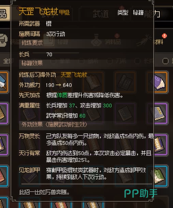此外,天罡飞龙杖的“天行有常”效果使得玩家在战斗中需要更加注重内伤的积累策略。如果能够在战斗初期快速累积到50点内伤,后续的每一击都可能是致命一击。而且,随着暴击伤害的提高,天罡飞龙杖的杀伤力将在短时间内急剧上升。