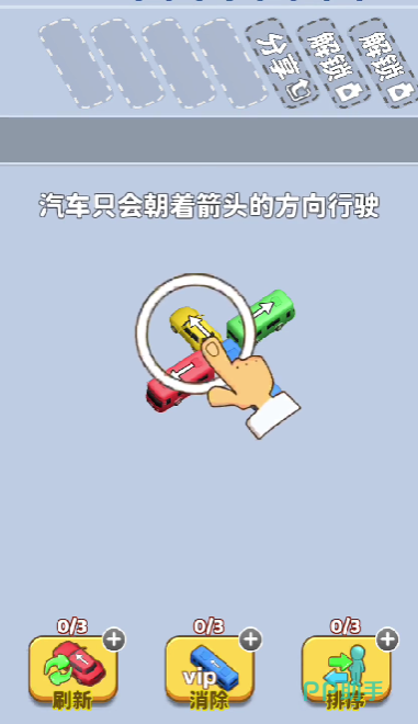 值得一提的是汽车只会朝着箭头所向着的位置移动所以只有往停车位方向朝向的汽车才能够抵达对应位点如果想要增加容错率,玩家可以提升停车位的数量,也可以直接刷新汽车的朝向,但是刷新功能在游戏中只能使用三次,如果超过了次数,玩家要么重新开始要么通过分享游戏来获得次数。