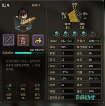 在这款游戏中,五维点的分配至关重要。琴修的开局建议从1悟开始,这不仅能大幅提升内力值,还可以让你在开局时迅速掌握强大的紫色内功。悟性高的情况下,学习高级内功的速度和效果都会大大提升。至于主属性,建议选择敏捷,因为1点敏捷相当于2点集气,这对琴修来说至关重要。至于其他属性,可以在游戏后期逐渐补足,建议将其提升到10点左右即可。