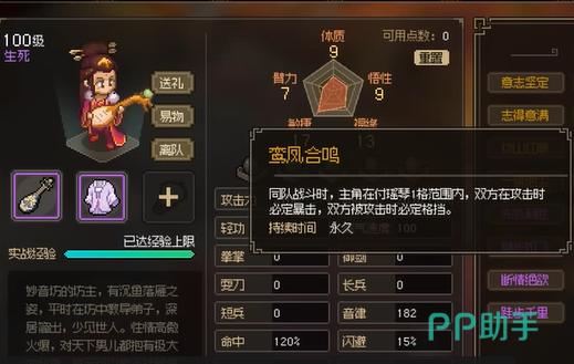 此外,玩家在完成剿灭三教的任务后,除了获得心法外,还会与付瑶琴的关系进一步提升,达到特定的好感度后,主角和付瑶琴将获得一个名为“鸾凤和鸣”的特征。这一特征不仅象征着两人关系的进一步发展,同时还能为战斗中的配合增添额外的效果。