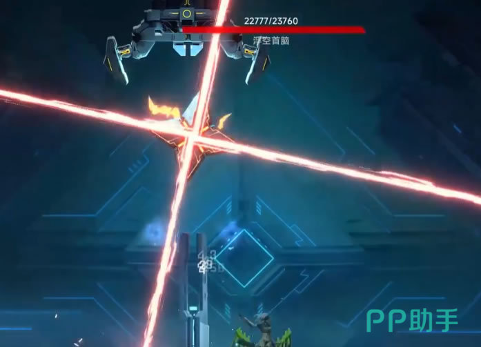 浮空首脑的上部分是没有任何攻击的,只是一个悬浮物,大家不需要理睬它;主要是对付漂浮在下的如同忍者十字镖一样的旋转体,而旋转体则是由上方首脑释放下来的。第一个被放下来的十字镖只有一种攻击方式,就是完全射程的镭射激光旋转。这种封锁攻击是无法闪避的,只能通过高速移动快速穿越以减少伤害,进入另一侧攻击。