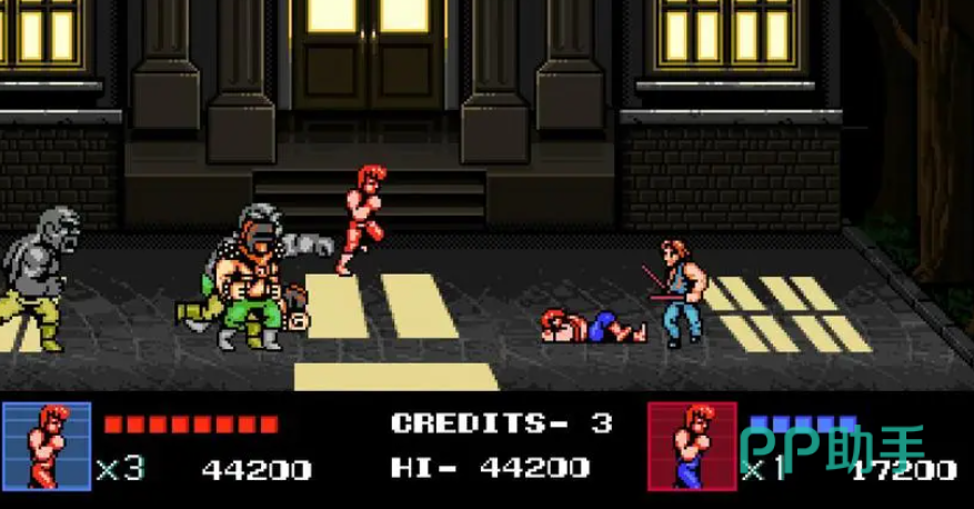 这款双截龙系列的第四代作品最多支持两个玩家一起挑战,创新加入了双人合体的必杀技,两个玩家相互靠近然后释放技能既可实现合击技能,打击手感一如既往的出色也是这款双截龙游戏最大亮点,双截龙系列经典BOSS一个不少都会在关底与你斗智斗勇,红白机的美术风格直接将玩家带回到童年时代。