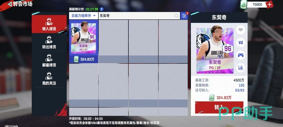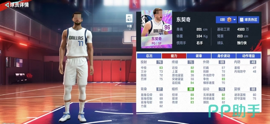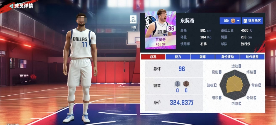 尽管他在游戏中的基础工资相对较高,达到4500万,这一数字反映出他一定有着不错的基础属性,高达96分的总评分还是比较推荐大家使用这个球员的,在紫色球员等级中,东契奇的身价属于中等水平,约为324.83万,这使他成为一位性价比相当高的角色,在基础属性方面,东契奇的投球能力尤为突出,达到94的高数值。