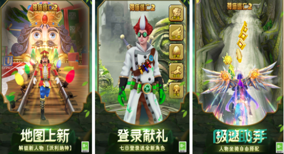 作为跑酷游戏中的热门之作,目前有几亿用户都已参与,其中是很多玩家从小玩到大的跑酷游戏。与上一代相比较起来做了全面升级,所有场景以及人物全部采用3d建模,拥有写实画面风格,玩家在恶魔守卫的追赶下完成激情追逃。游戏的可玩性较高,有一条怎么跑都跑不完的路程,也许胜利就在前方,但前方面临的是众多障碍。