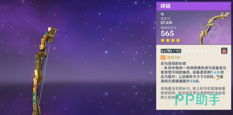 碎链,高白值低攻击力词条,特效是每有1个纳塔角色或者装备者不同元素的角色时,可以给到装备者攻击加成,最多3层也就是28.8的攻击,同时满3层有多48点精通。甘雨、达达利亚都挺适合。
